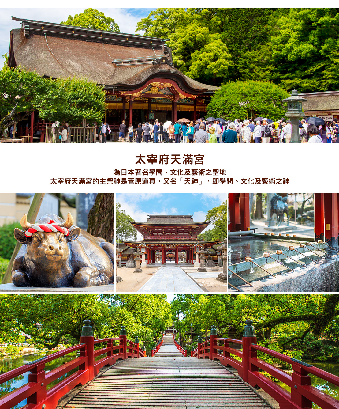 日本各地供奉著學問之神~菅原道真的天滿宮的總本宮是福岡有數的觀光名勝。傳說境內的"飛梅"神樹是在公元901年(延喜元年),菅原道真被降職至此地時一夜之間從京都飛來,每年1月下旬到3月下旬會開岀美麗的白色梅花。