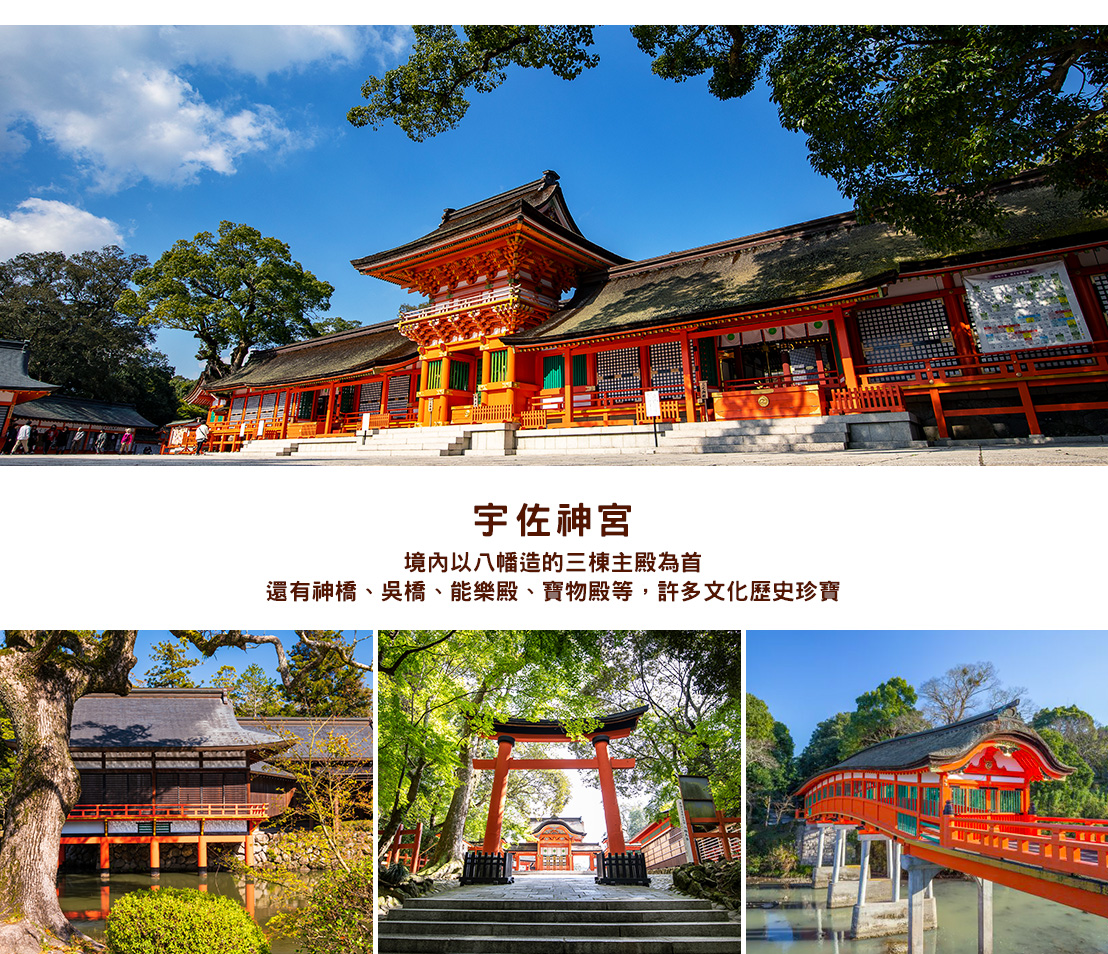 宇佐神宮建造於725年,作為全國擁有4萬多分社的八幡社主神社而聞名,每年都吸引了無數的參拜者到訪。坐落於太古時代的原生林裡的神社,壟罩在清新的空氣中。境內以八幡造的3棟主殿(國寶級)為首,還有神橋、吳橋、能樂殿、寶物殿等許多歷史文化上貴重的建築物。
