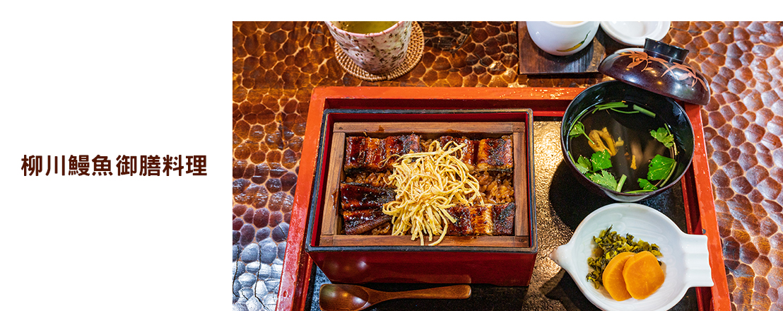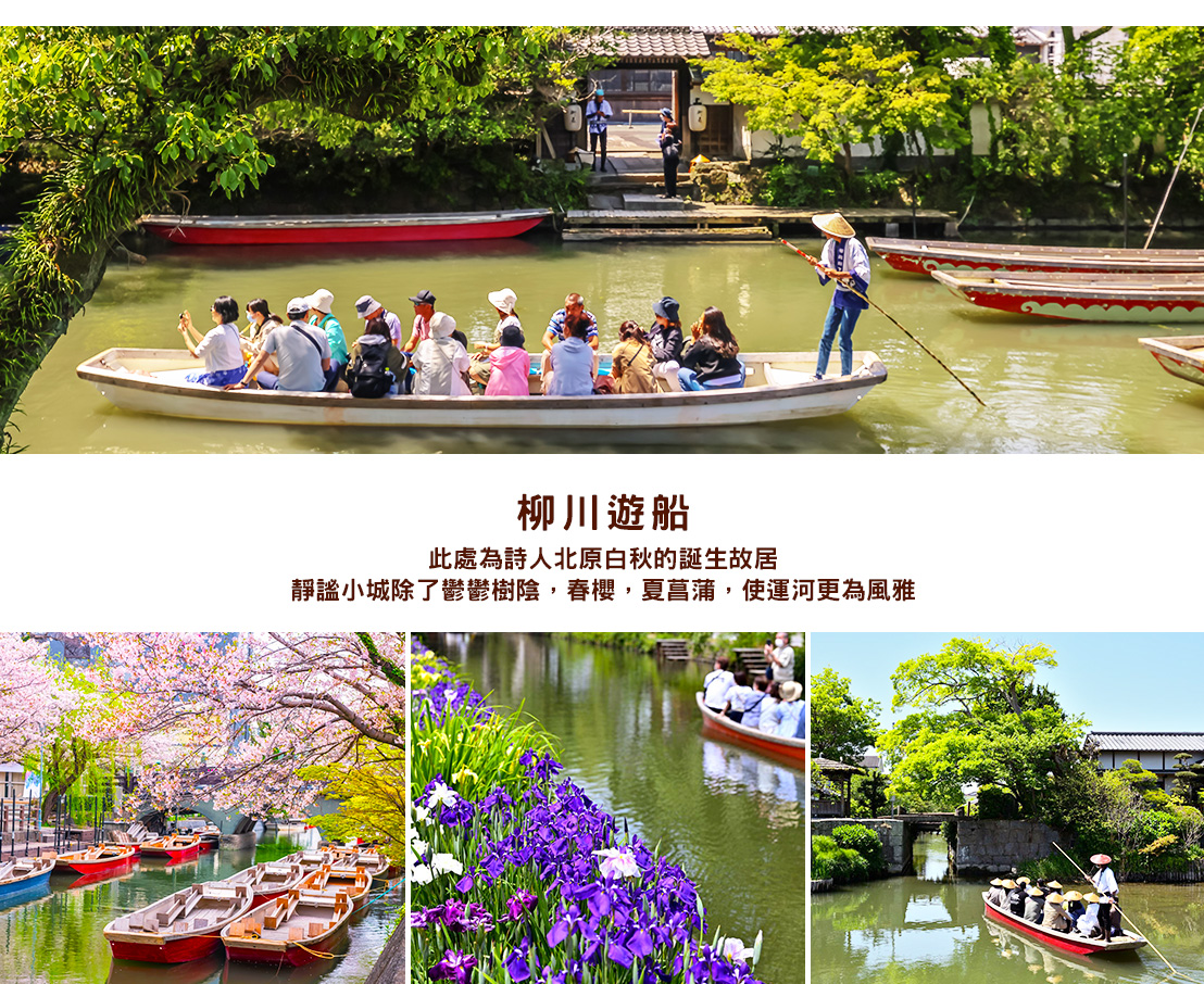 位於福岡縣西南部的柳川市是築後川注入有明海的河口水鄉地帶。這裏昔日曾是"城下町",繁盛一時。沿著垂柳投影的舊柳川城的水渠乘坐叫作“到恩拷”的小船悠哉地順流而下,可眺望沿岸在20世紀初用紅磚建造的排倉和用灰土砌成的土倉等景觀,悠然自在。在菖蒲和波斯菊盛開的季節,更是錦上添花。在冬季,遊客們可坐在小船上的被爐裏,一邊取暖一邊觀光。船老大的掌舵技術絕妙高超,還帶觀光點的解說,邊划船、邊吟唱柳川小調,是人文薈萃文學家最多的地方。而此處也是復原了詩人北原白秋的誕生故居,古意盎然的靜謐小城除了柳樹飄揚,傳統的庭園造景、優雅運河,更增無限詩意。