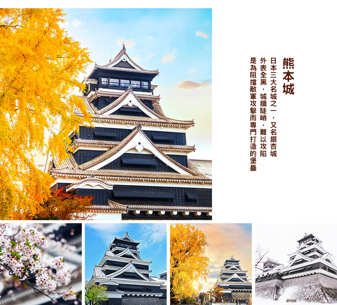 熊本城位於九州的熊本縣,不僅是百大名城之一,更是日本的三大名城(另兩個為名古屋的名古屋城及大阪的大阪城),別名銀杏城,原因是在建造熊本城時考慮到圍城戰需要有糧食,所以種植了大量的銀杏,此外在城內的地席也都是利用芋莖(芋頭的莖)曬乾做成,當作戰備儲量。