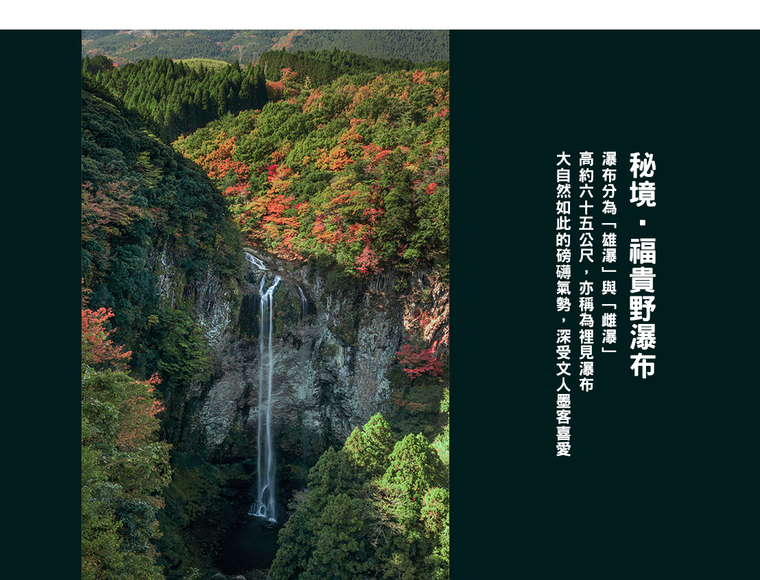 福貴野瀑布有「雄瀑」與「雌瀑」,瀑布高約65m,也被稱為 "裡見瀑布",因為它可以從瀑布內看出去,讓人感受到與平常不同一般的特殊景致。此外富貴野瀑布也被稱為 "龍泉寺瀑布",從龍泉寺後面的瀑布觀景臺上看去,景色非常美麗,深受許多文人墨客喜愛。