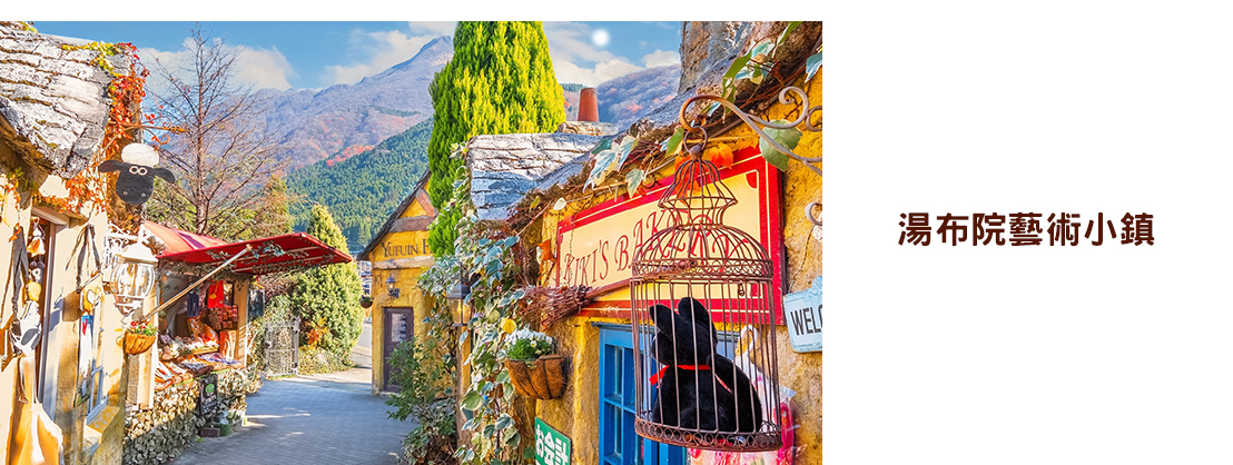 位於由布岳山腳下,有許多美術館及畫廊,是一個寧靜優雅的山中城鎮,溫泉更是自古聞名。此外熱鬧、歡騰的藝術活動,更使來訪者捨不得離開。湯布院街道充滿藝術氣息的城鎮,經常榮登日本人氣之觀光區;在此您可盡情享受城鎮的好山好水好風光,其精巧的陶藝、木雕、彩繪玻璃及壓花等民間藝術皆極出色。
