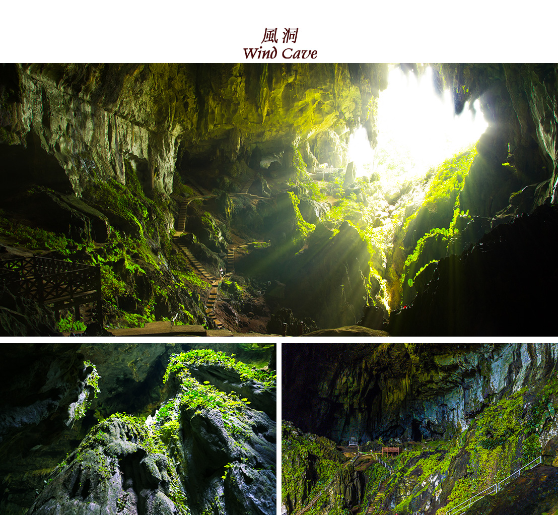 【風洞】洞口處通往另一端的窄道,結構上剛好是個風口,為洞穴內送入陣陣涼風。兩者異曲同工。風洞的面積不及仙洞大,結構上也不盡相同,小溪川流而過,燕子和蝙蝠群棲息洞穴內,景致獨特。