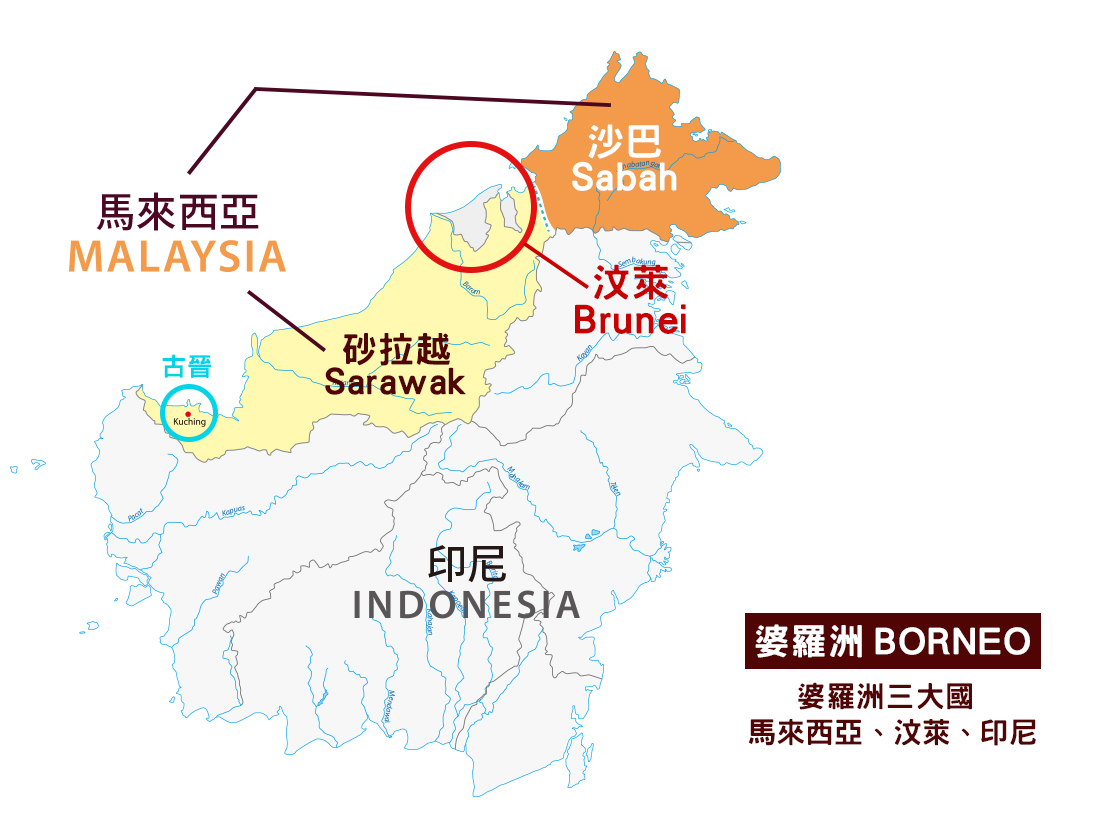 婆羅洲//是世界第三大島嶼,亞洲第一大島,面積743,330平方公里,僅次於格陵蘭及新幾內亞。州上有三國,分別為馬來西亞(沙巴、砂拉越)、汶萊及印尼(加里曼丹)所擁有。赤道穿過島中央,溫熱濕雨的氣候形成孕育豐富自然生態物種的廣大熱帶雨林。