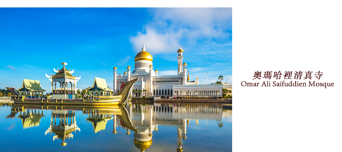 【奧瑪阿里清真寺(外圍參觀)】:參觀汶萊標誌性建築物,是由第28任國王修建的,也是首都斯里巴加灣市的象徵,與傑米清真寺的靜謐脫俗的精緻相比,奧瑪阿里清真寺則顯得雍容華貴的大氣。清真寺前方清幽如鏡的湖水被一艘石舫點綴,恰好與藍天白雲構成一幅純天然畫卷。