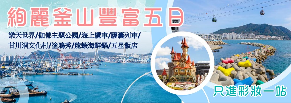 2026/04/16(四) | 桃園國際機場出發 (虎航)《只走彩妝》【絢麗釜山豐富5日】樂天世界、海上纜車、膠囊列車、甘川洞文化村、塗鴉秀、升等一晚五星飯店機位 20 候補0 已售0 可售19※ 聯營團體 ※ |
