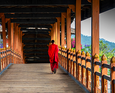 【奇楚拉康Kyichu Lhakhang】參觀吐蕃王朝時期,由松贊干布王所建的千手千眼觀音寺,與江貝拉康(Jambey Lhakhang),同為公元659年,吐蕃王朝松贊干布,鎮壓魔物建造的108座廟之一,是不丹最古老的佛寺之一,亦是藏傳佛教在不丹發揚的重要寺廟。除了具備藏傳佛教發揚的代表性意義外,當您踏入寺廟,右手邊的走廊是傳說中的西藏戰神薩格爾王的壯美史詩,據說是世界上最長之作;另觀賞寺廟一隅,會看到由之鳴橋梁建築師Thangtong Gyapo所建築的特色鐵橋。另外寺院裡的木雕畫作也是堪稱一絕。