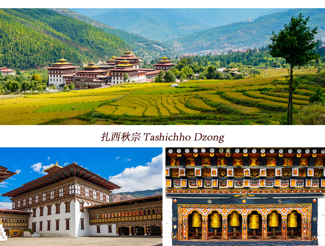 扎西秋宗 Tashichho Dzong,集「政、教、法」於一身的宏偉白色城堡,始建於13世紀。為現任國王辦公室、內政部、財政部及宗教首領(基堪布)的夏季駐所,被譽為「光榮宗教的堡壘」。