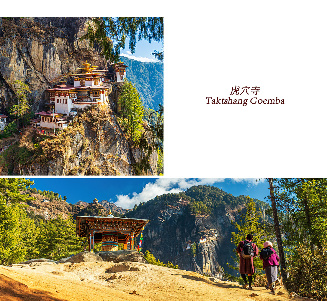 【虎穴寺Taktshang Goemba】相傳8世紀時,蓮花生大師騎著飛虎,從西藏欲返印度時經過此地,發現惡魔作祟,大師顯現八變之一的忿怒尊相化身,為金剛多羅Dorje Droloe降臨在山壁岩洞中,在山洞內閉關三個月,成功降妖伏魔,並弘法安撫了當地的邪惡勢力,使之成為一方淨土。虎穴寺剛好是惡魔的頭,因此蓮師選擇此地閉關以鎮之;這裡也是蓮師把佛教思想傳入不丹的起點。虎穴寺建在海拔3100公尺高的塔克山峭壁上,抬頭仰望真令人讚古人建築之浩大,1684年信眾在蓮師閉關的冥想洞附近修建主廟1694年完工,是不丹最重要的建築!