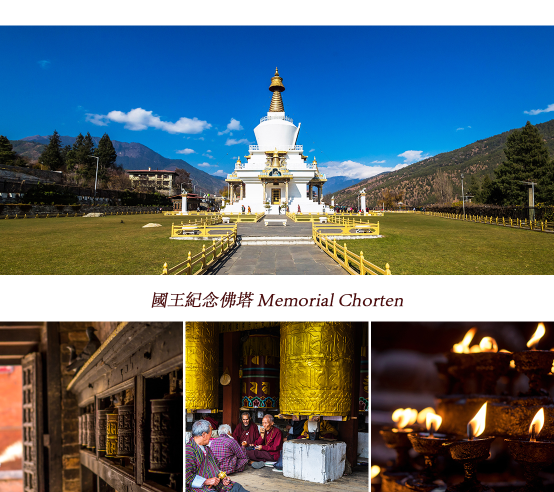 【國王紀念佛塔(Memorial Chorten)】這座佛塔周圍常可見信眾一邊轉經輪、一邊低聲誦經,圍繞佛塔虔誠轉行。此地標建築是第三任國王吉美·多吉·旺楚克(被尊為「現代不丹之父」)生前為祈願世界和平與繁榮而構思的願景。該佛塔於1974年完工,作為對已故國王的紀念,同時也象徵和平之塔。