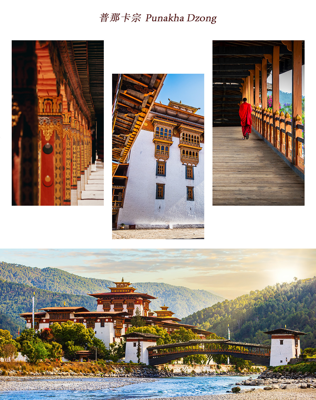普那卡宗 Punakha Dzong,建於1637年,座落於母親河 Mo Chhu 與父親河 Pho Chhu 交匯處。曾是不丹首都與政治中心,如今是基堪布大主教的冬宮,內藏有許多珍貴佛教聖物與歷史文獻。