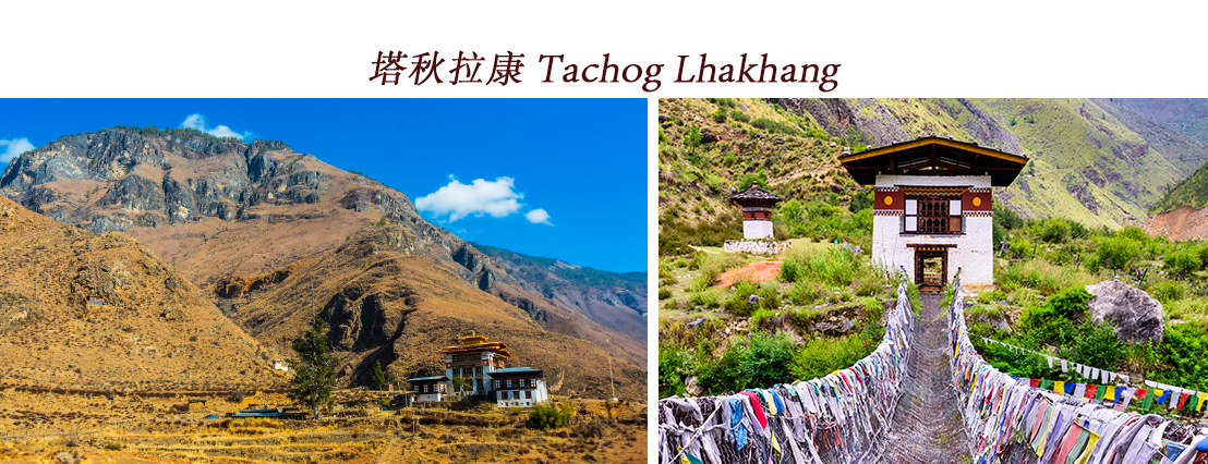 【塔秋拉康 Tachog Lhakhang】意為「神駿之馬的寺廟」。這是一座私人寺廟,.建於 15 世紀。起因是一位名為巴拉哈 ( Balaha ) 的神駿之馬顯靈顯現一一牠是慈悲佛陳那瑞孜(Chenrezig ) 的化身。旁邊蒂塔秋鐵索橋是14世紀不丹著名鐵索橋建造師~唐東嘉波(Thangtong Gyalpo)所建的代表作之一,大家可以體驗舊索橋旁的新索橋步行體驗。
