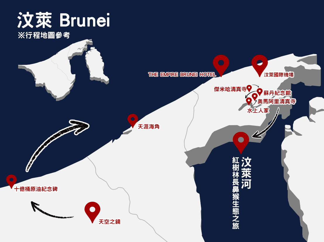 ◆安排汶萊獨特的水上人家作客,體驗真正水上人家的日常生活作息並享用道地的茶點,以及安排乘船尋找婆羅洲獨有的野生長鼻猴,讓您體驗真正的知性之旅。