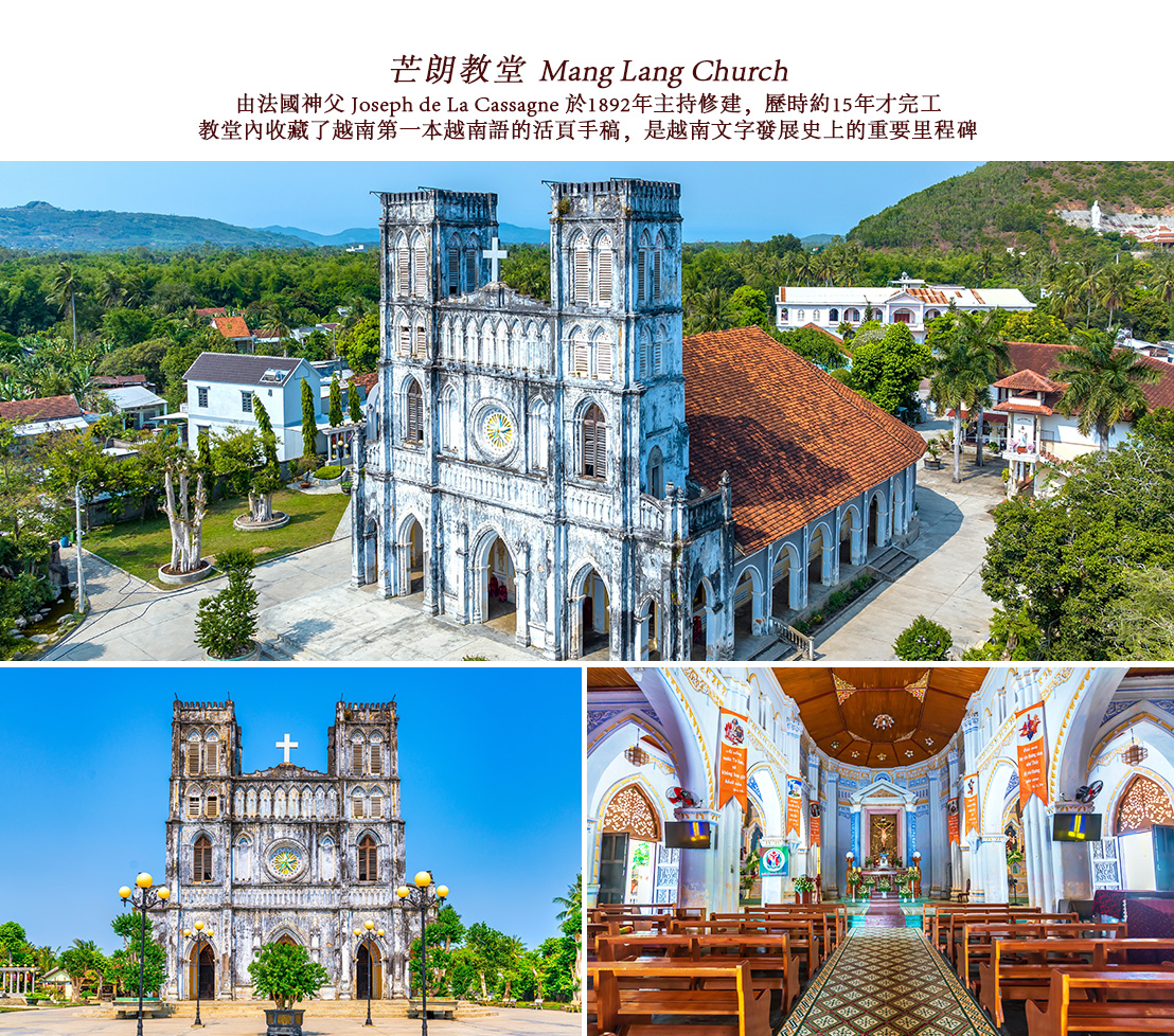 芒朗教堂 Mang Lang Church 由法國神父 Joseph de La Cassagne 於1892年主持修建,歷時約15年才完工。 教堂內收藏了越南第一本越南語的活頁手稿,是越南文字發展史上的重要里程碑。