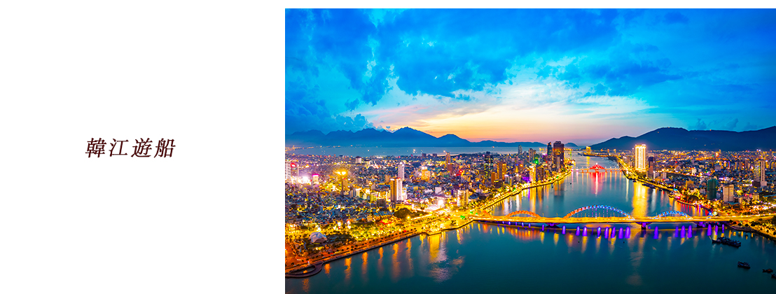 韓江遊船,緩緩航行於城市燈火與星光交織的夜色中。峴港最具代表性的地標,龍橋,入夜後打上燈光,顯得更為迷人。