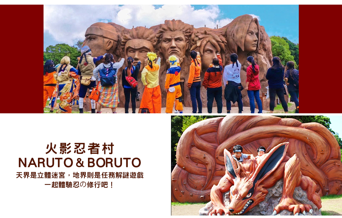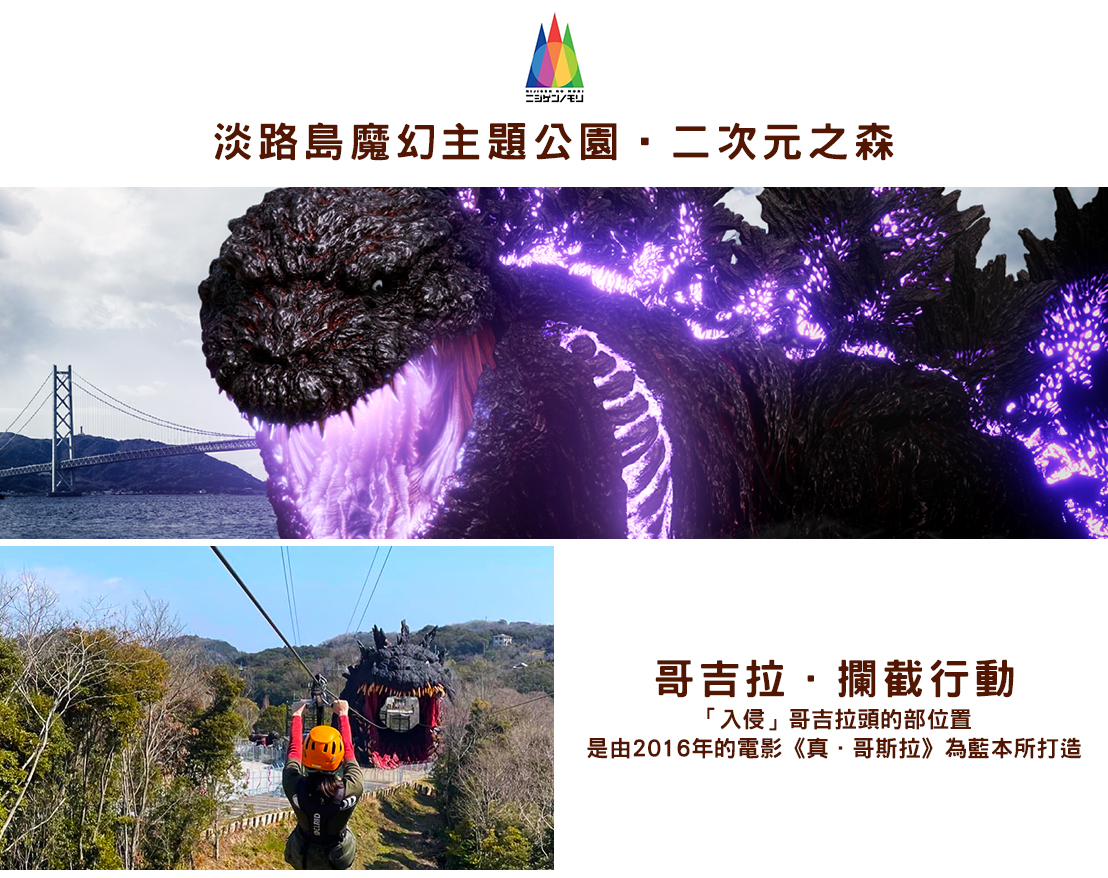 淡路島魔幻主題公園•二次元之森,哥吉拉•攔截行動、火影忍者村 (NARUTO & BORUTO)。您可以親身體驗精采的「二次元」日本動畫、漫畫與遊戲作品!