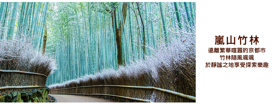 嵐山竹林,在下雪的日子裡,白雪覆蓋竹葉,陽光灑落,光影交錯,形成一幅如詩如畫的景象。