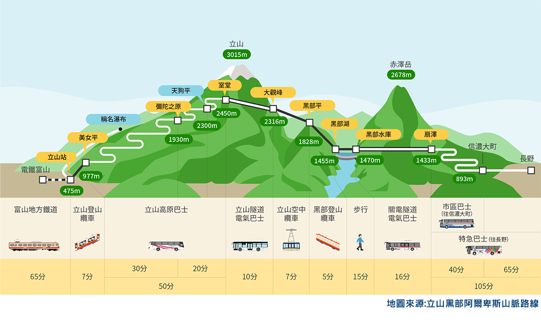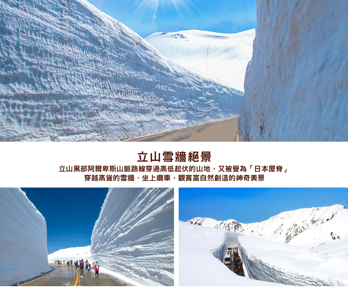 ※ 室堂 4-6 月之間平均高溫為 6-14℃,平均低溫為 -3℃ 到 7℃ 之間,在此期間,室堂和彌陀原都還覆蓋著白雪,大雪壁非常寒冷,請務必注意防寒保暖。
