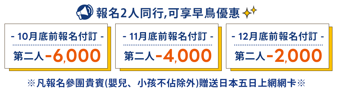 ※10月底前報名2人同行付訂,團費可享最大早鳥折扣 |