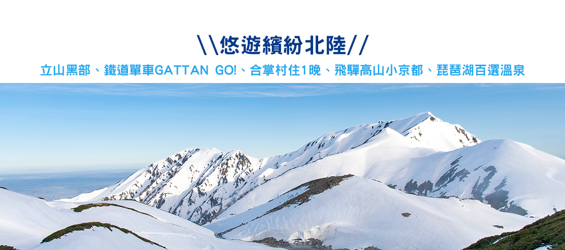 長榮【悠遊繽紛北陸五日】立山黑部、鐵道單車~GATTAN GO!童話世界合掌村住1晚、飛驒高山小京都、琵琶湖百選溫泉 |